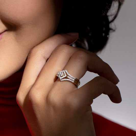 Regular price ₹ 34,041.00Regular priceUnit price / per0.00Sale price ₹ 34,041.00This ring features a classic solitaire design with a modern twist. The central focus is a round brilliant-cut diamond held in a prong setting, showcasing its brilliance. The band splits into two parallel strands as it approaches the center stone, creating a unique "criss-cross" effect. Each of these strands is pavé-set with small, round diamonds, adding sparkle and enhancing the overall design.