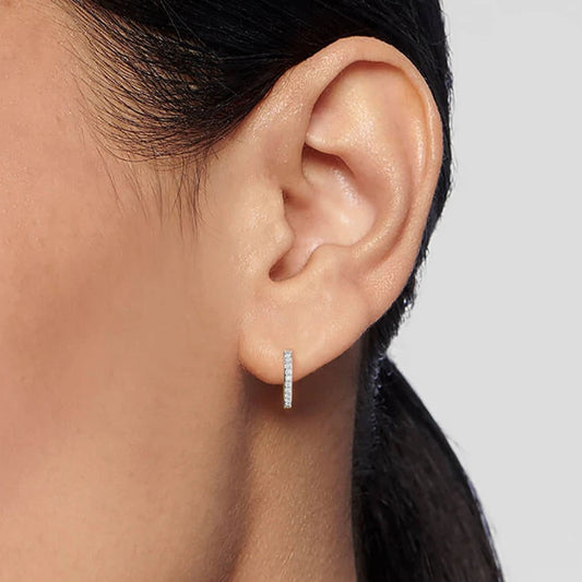 These elegant hoop earrings feature a classic, slightly oval silhouette crafted in warm gold. A row of small, round diamonds is meticulously set along the front half of each hoop, creating a subtle yet captivating sparkle. The diamonds are likely pave-set, ensuring a continuous line of brilliance that catches the light beautifully.